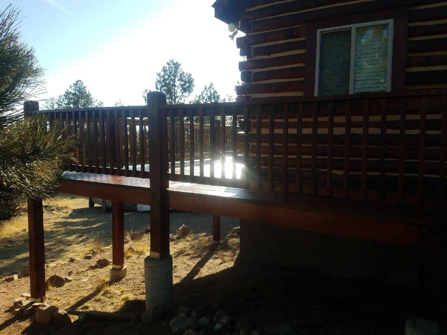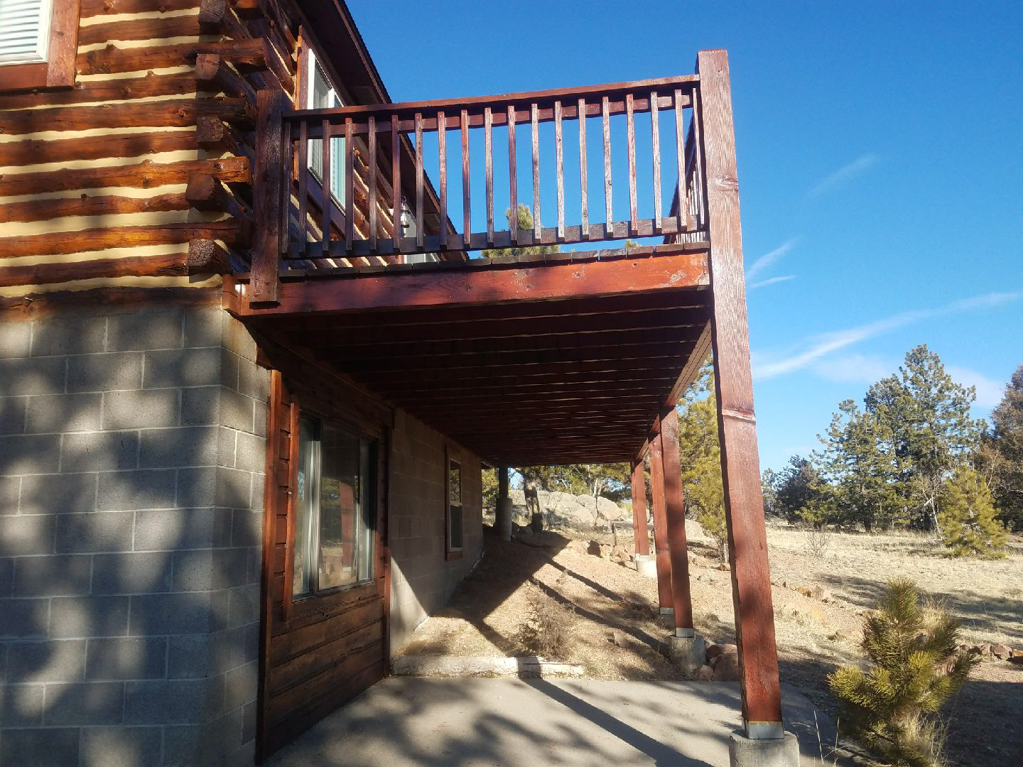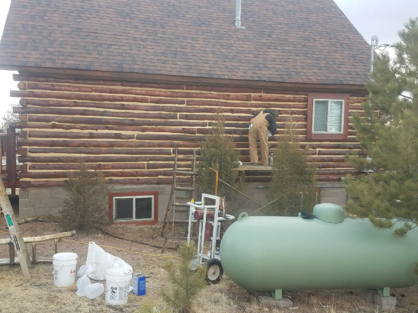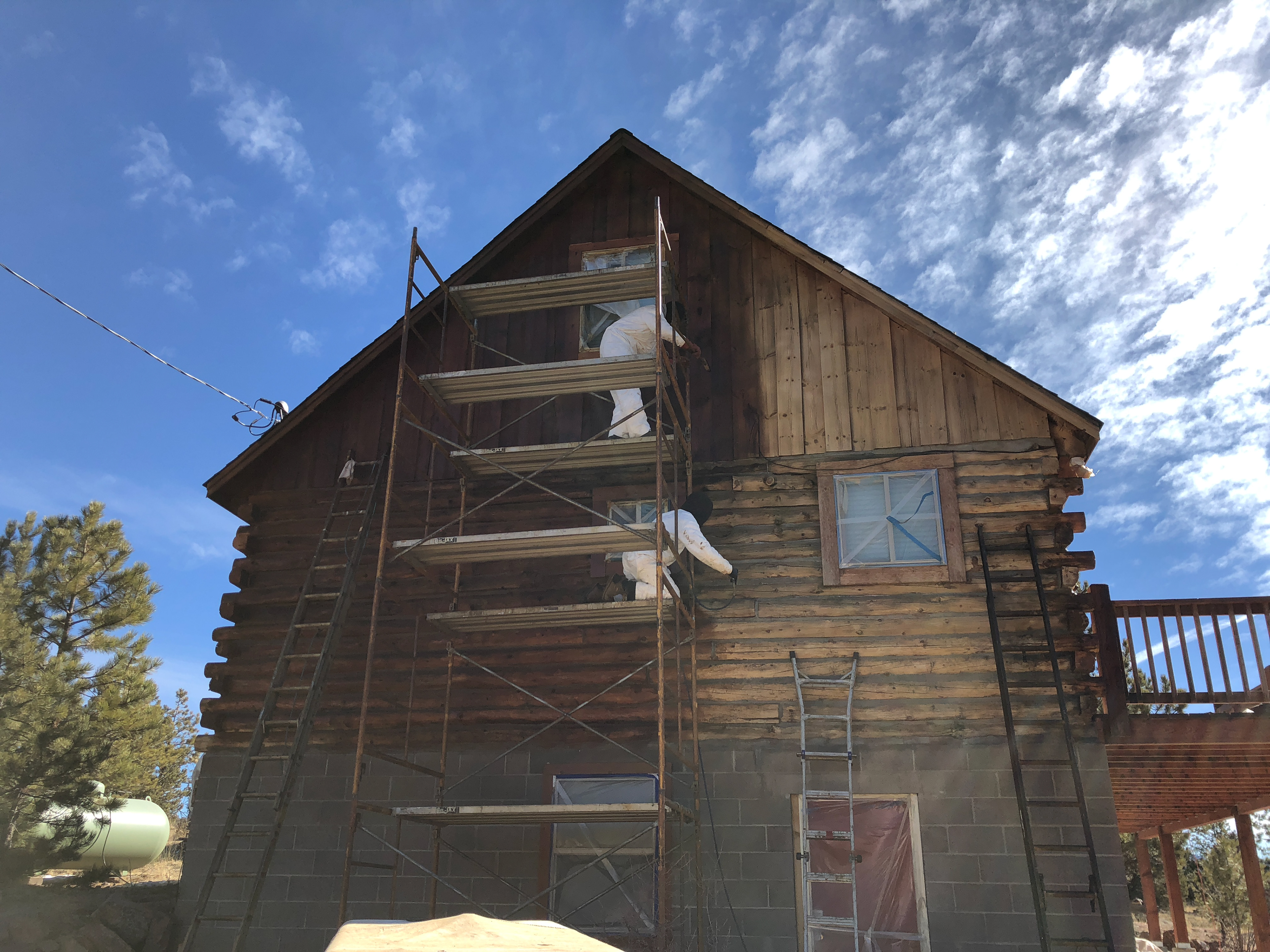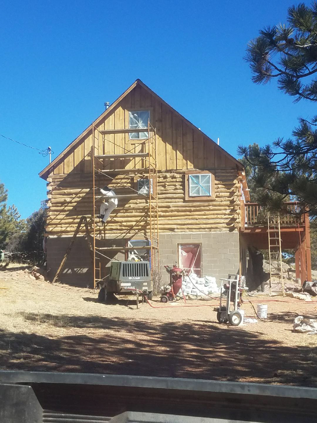 Log Home Finishing project in Florissant Teller County Colorado.  This log home cabin built in the 1970’s received media blasting to remove damage and old finishes and paint that had been applied to the logs.  Stain is Sashco Transformation Redtone Medium and chinking is Log Jam Tan color.